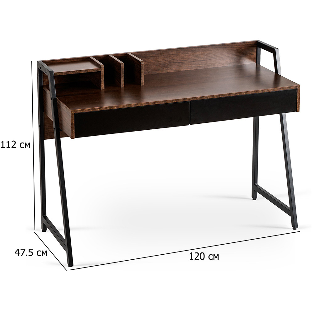 Письмовий стіл Cass з двома висувними шухлядами в стилі лофт - відмінний вибір для тих, хто шукає мінімум форми та максимум стилю та функціональності. Стільниця та корпус виконані з ламінованого МДФ кольору горіх. Профільовані ніжки виготовлені зі сталі та пофарбовані порошковою фарбою у чорний колір. Дві висувні шухляди без ручок та додатковий органайзер дозволять ефективно організувати робочий простір. Ця модель - ідеальний вибір для тих, хто цінує максимальну практичність у модному виконанні.