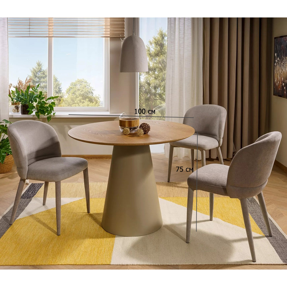 Сучасний круглий стіл Angel з трьома бежевими тканинними стільцями Tino виглядає елегантно та дуже стильно. Стільниця виконана зі шпонованого МДФ у кольорі дуб, доступний в інших кольорах. Стильна ніжка виготовлена з лакованого МДФ у кольорі кашемір. Таке дизайнерське рішення сподобається людям, які шукають сучасні та оригінальні рішення для свого інтер'єру, що привертають увагу. Завдяки своєму дизайну, стіл буде ідеально виглядати як з сучасними, так і з традиційними інтер'єрами, надаючи приміщенню неповторний шарм.